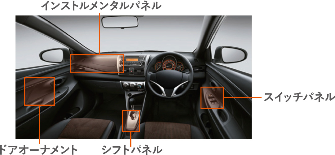 低炭素・資源循環型社会の実現に向けた、木材繊維強化再生ポリプロピレン材料。再生ポリプロピレンを木材繊維で強化した環境に優しい高性能材料です。市場回収した再生ポリプロピレンを100% 適用しながらも、バージン材適用品と同程度の物性を示します。また、汎用的なタルク強化ポリプロピレン材料に比べて物性バランスに優れ、材料の置き換えによる部品の軽量化に貢献します。木材由来の自然な風合いを意匠として活用できるため、自動車部品のデザインの幅が広がり、質感を高めることが可能です。