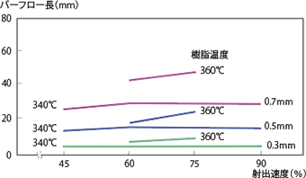 薄肉流動性は射出速度の影響をあまり受けません。射出速度が大きすぎるとヤケ等の不良原因となる場合があります。