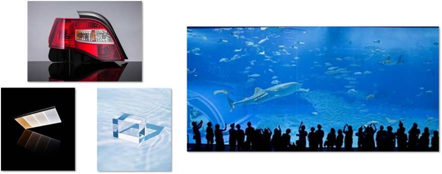 Among synthetic resins, it has outstanding transparency and a beautiful gloss, and is widely used in applications such as automobile tail lamps, lighting fixtures, signage, aquarium tanks, and optical components for LCD displays.