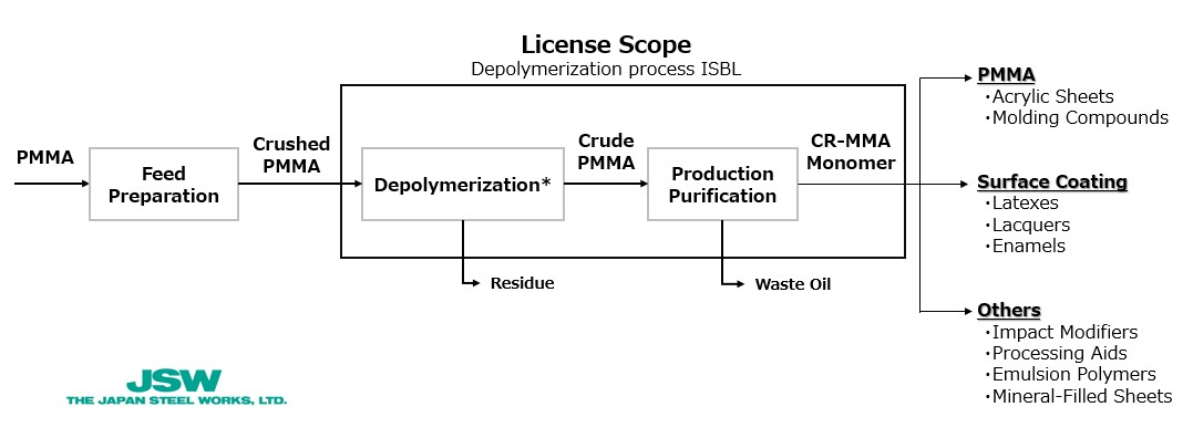 The Japan Steel Works, Ltd. (JSW)’s continuous plastic depolymerization technology using twin-screw extruders with our expertise in MMA monomer and PMMA resin manufacturing.